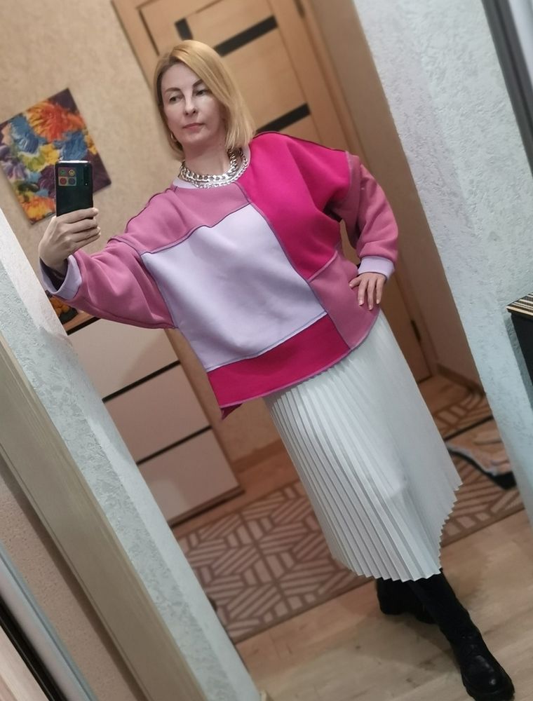 Мы использовали: футер-трехнитку с эффектом велюра плотностью 300 г/м2, кашкорсе плотностью 420 г/м2.
